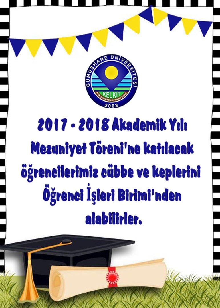 2017 - 2018 Akademik Yılı Mezuniyet Töreni'ne katılacak öğrencilerimiz cübbe ve keplerini Öğrenci İşleri Birimi'nden alabilirler.