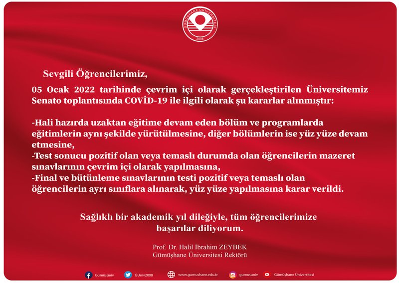 Covid- 19 salgınıyla ilgili olarak Üniversitemiz Senatosu tarafından uygulanacak adımlar belirlendi. Üniversitemiz Senatosu’nun 05.01.2022 tarihli ve 285 sayılı çevrim içi toplantısında;