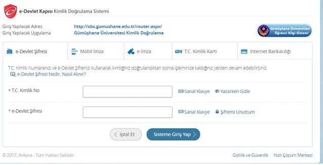 Öğrenci giriş Otamasyonuna "e-Devlet ile Giriş" butonuna tıklayarak T.C. Kimlik numaranız ve e-devlet şifrenizle giriş imkanı sağlanmıştır. 2017-2018 Öğretim Yılı Güz Yarıyılında deneme aşamasındadır. Bahar yarıyılında ise tamamen e-devlet şifresi kullanılacak olup üniversitemizin giriş için vermiş olduğu şifre ise devre dışı bırakılacaktır.