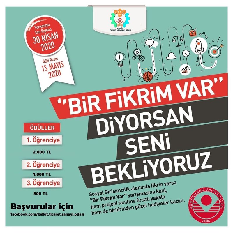 ‘’Gümüşhane İçin Bir Fikrim Var Proje Yarışması” ile gençler hem kazanacak hem de yaşadıkları şehrin kırsal bölgelerine katkı sağlayacaklar. Gençlerin, kültürel ve ekonomik gelişimine katkı sağlayacak yarışma; Turizm Projeleri, Sosyal Yaşam, Sağlık ve Eğitim Projeleri, Kırsal Alan Alt ve Üst Yapı Projeleri ve Yenilikçi Alternatif Tarım ve Hayvancılık Projeleri alanlarında yenilikçi, uygulanabilir, toplum ve yerleşim alanlarının yararına olabilecek fikirler ile gençlerin üretime katkı sağlaması ve kendilerini geliştirmelerine fırsat sunulması amaçlanıyor. Yarışmaya katılacak projelerin, özgün ve yaygın etki alanına sahip olması, Ar-Ge niteliği taşıması, gerçekçi ve uygulanabilir olması ön planda tutulmakta. Ayrıca yarışmaya katılan her proje, Kelkit Ticaret ve Sanayi Odası tarafından uygulanması muhtemel projeler arasına alınacaktır.