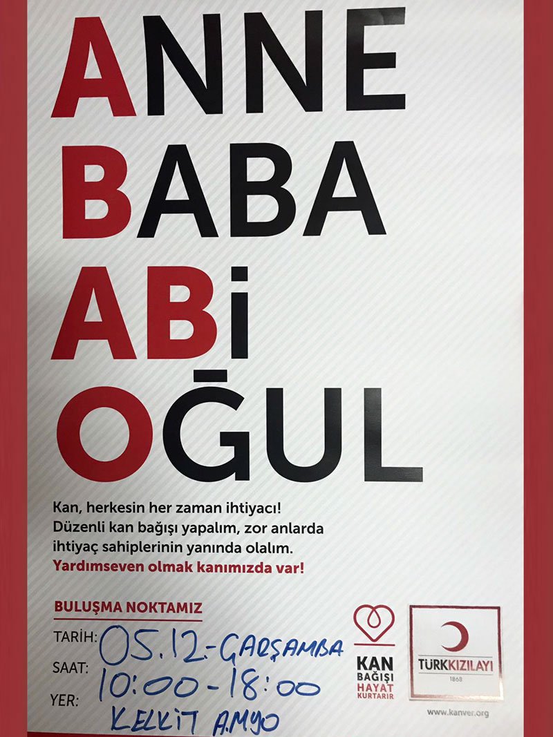 Kan bağışı yapmak isteyenler Kampüs alanındaki belirtilen tarihte Kızılay gezici kan bağışı tırını ziyaret ederek bağışta bulunabilirler.