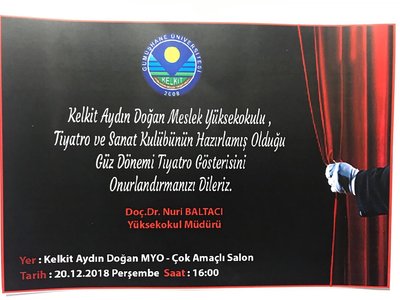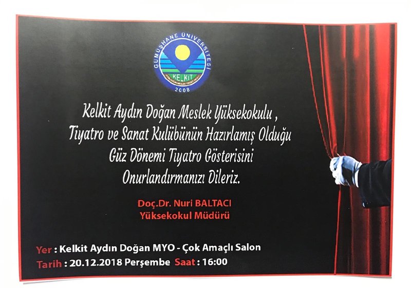 Kelkit Aydın Doğan Meslek Yüksekokulu Tiyatro ve Sanat Kulübü danışmanları Dr.Ögr Üyesi Nilgun Doğan ve Öğr Gör Demet Akkaya Bellikli tarafından hazırlanan tiyatro gösterisi 20 Aralık Perşembe saat 16.00'da konferans salonunda sunulacaktır. Tüm öğrencilerimiz davetlidir.
