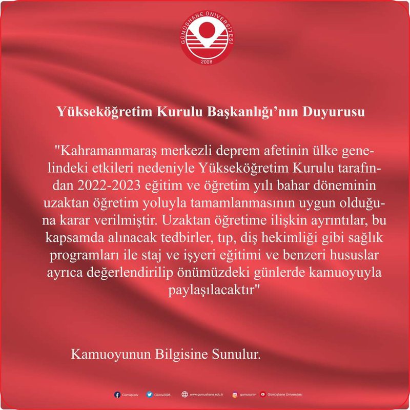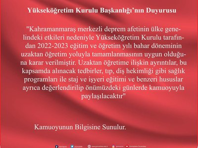"Kahramanmaraş merkezli deprem afetinin ülke genelindeki etkileri nedeniyle Yükseköğretim Kurulu tarafından 2022-2023 eğitim ve öğretim yılı bahar döneminin uzaktan öğretim yoluyla tamamlanmasının uygun olduğuna karar verilmiştir. Uzaktan öğretime ilişkin ayrıntılar, bu kapsamda alınacak tedbirler, tıp, diş hekimliği gibi sağlık programları ile staj ve işyeri eğitimi ve benzeri hususlar ayrıca değerlendirilip önümüzdeki günlerde kamuoyuyla paylaşılacaktır"