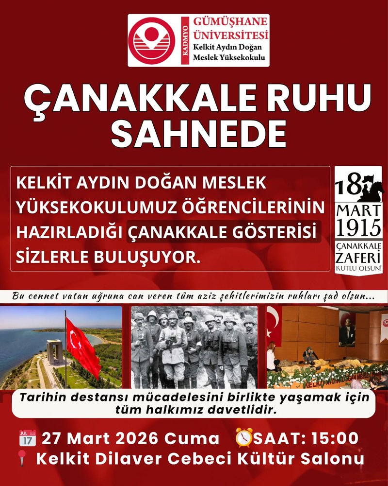 Yüksekokulumuz Öğrencilerinin Hazırladığı Çanakkale Gösterisi, 27 Mart Cuma Günü Saat 15.00’te Kelkit Dilaver Cebeci Kültür Salonu’nda Gerçekleştirilecektir.