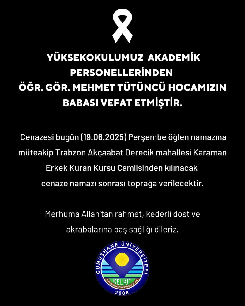 Yüksekokulumuz Akademik Personellerinden Öğr. Gör Mehmet TÜTÜNCÜ Hocamızın Babası Vefat Etmiştir.