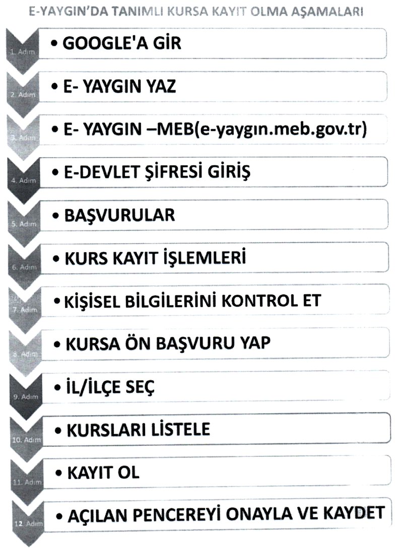 Başvurmak isteyen öğrenciler, internet üzerinden aşağıdaki kursa kayıt olma aşamalarını izleyerek e-Yaygın linki aracılığıyla e-Devlet şifresi ile giriş yaparak kayıt olabilirler.
