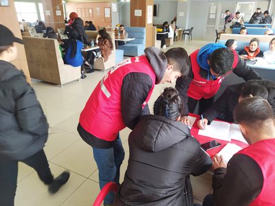 Gezici kan bağışı aracının girişinde bilgilendirme formunu dolduran personel ve öğrencilerimiz daha sonra tır içinde bulunan sağlık ekipleri tarafından sağlık kontrolünden geçirildikten sonra kan bağışları alındı.