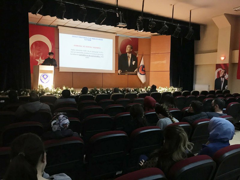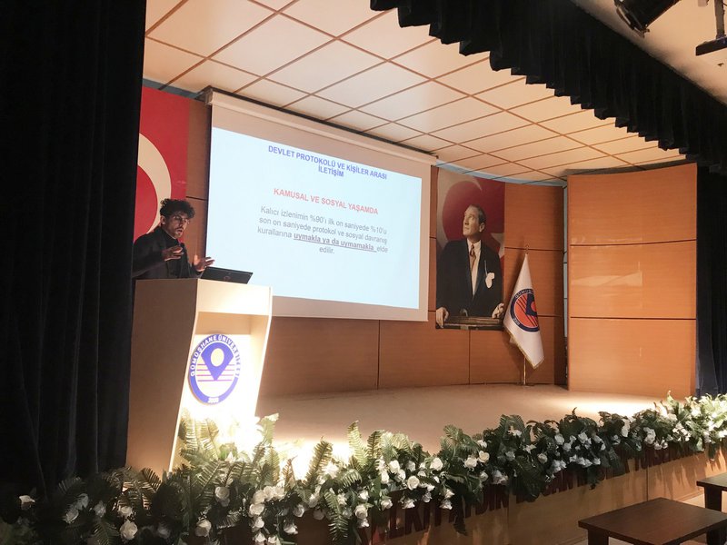 Öğr. Gör. Alperen AĞAÇ hocamız tarafından Devlet protokolü ve nezaket kuralları, Tokalaşma, hitap, makamda davranış protokolü, üstlerle protokol ilişkileri, toplantı protokolü, resmi davet ve ziyaret protokolü konularına dair protokol kurallarıyla ilgili bilgi vererek Devlet törenleri, diplomatik toplantılar gibi protokolün uygulanması gereken yerlerde katılımcıların oturma düzenine ve hitap biçimleri, resmi hayatta kişilerin yerine unvanların olduğunu, protokolde kişiye değil makama saygı gösterilmesi gerektiğini belirterek Akademik ve idari personele katılımlarından dolayı teşekkür etti.
