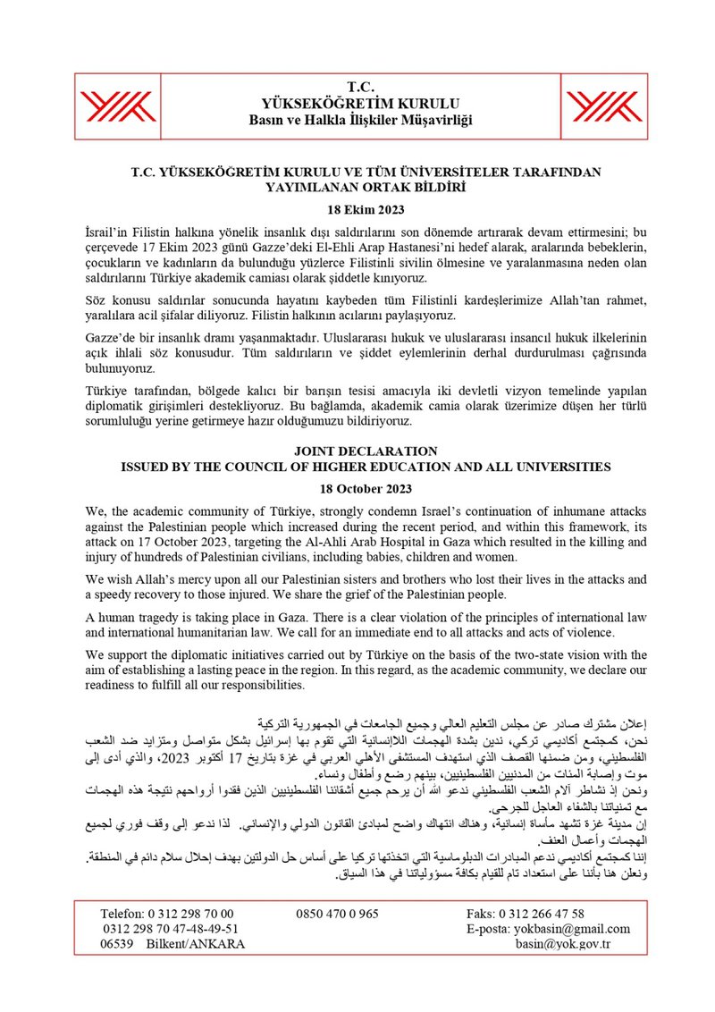 T.C. Yükseköğretim Kurulu ve Tüm Üniversiteler Tarafından Yayımlanan Ortak Bildiri