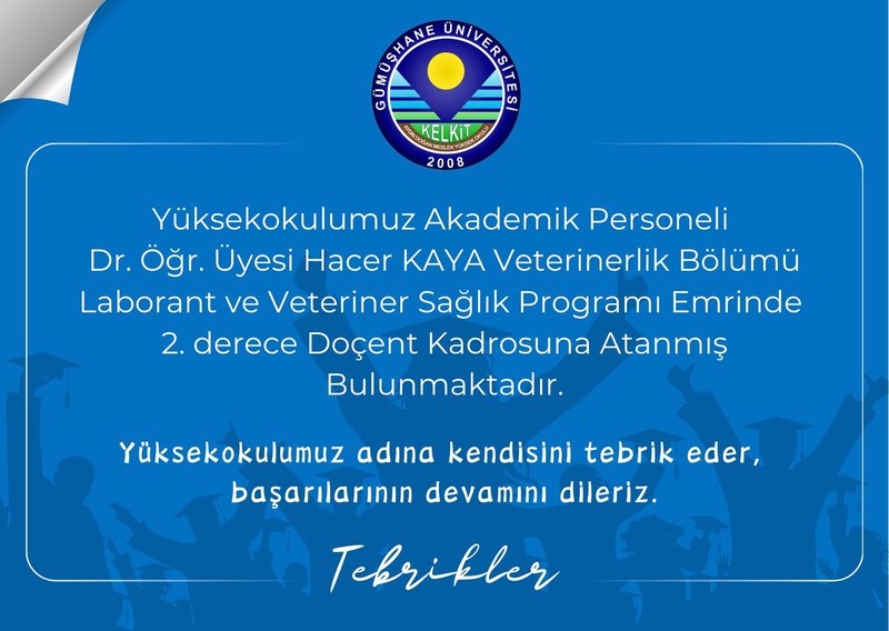 Yüksekokulumuz Akademik Personeli Dr. Öğr. Üyesi Hacer KAYA Veterinerlik Bölümü Laborant ve Veteriner Sağlık Programı Emrinde 2. derece Doçent Kadrosuna Atanmış Bulunmaktadır.