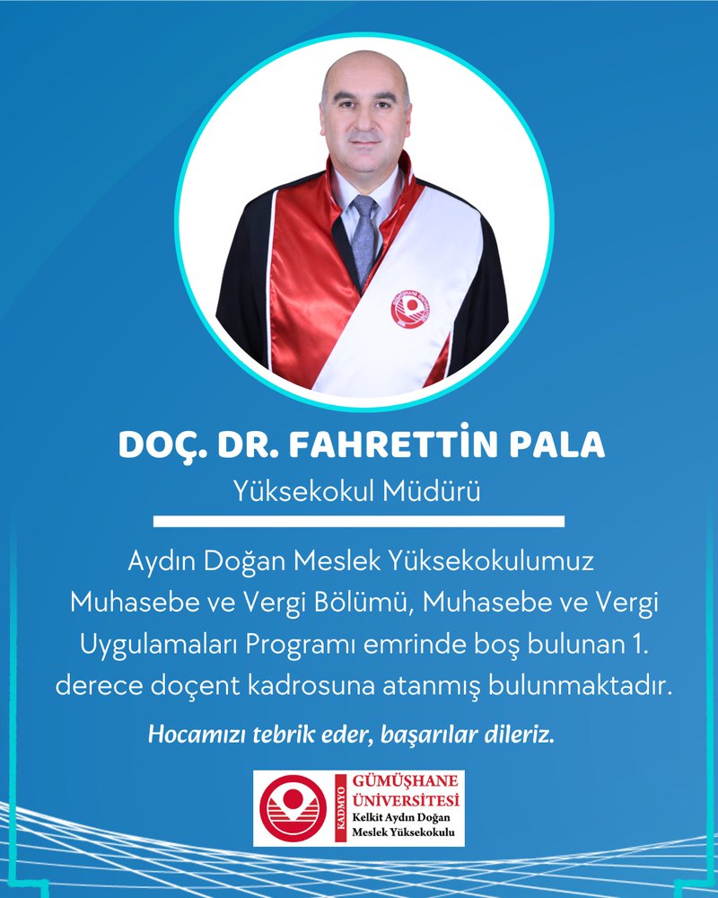 Yüksekokulumuz Akademik Personellerinden Doç. Dr. Fahrettin PALA Muhasebe Ve Vergi Uygulamaları Programı Emrinde Boş Bulunan 1. Derece Doçent Kadrosuna Atanmış Bulunmaktadır.