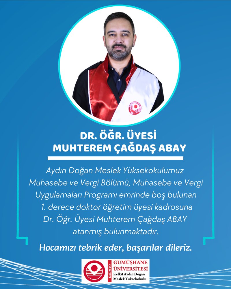 Yüksekokulumuz Akademik Personellerinden Dr. Öğr. Üyesi Muhterem Çağdaş Abay Muhasebe Ve Vergi Uygulamaları Programı Emrinde Boş Bulunan 1. Derece Dr. Öğr. Üyesi Kadrosuna Atanmış Bulunmaktadır.