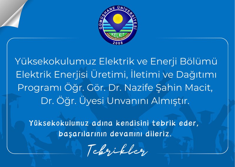 Yüksekokulumuz Elektrik ve Enerji Bölümü Elektrik Enerjisi Üretimi, İletimi ve Dağıtımı Programı Öğr. Gör. Dr. Nazife Şahin Macit, Dr. Öğr. Üyesi Unvanını Almıştır.