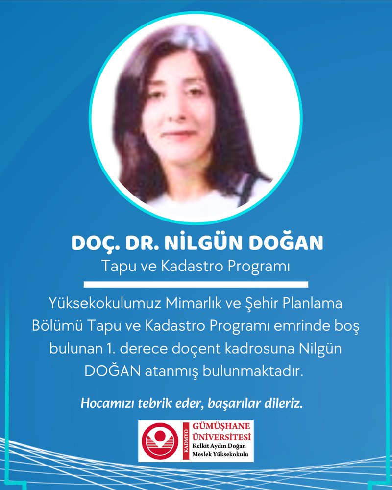 Yüksekokulumuz Mimarlık Ve Şehir Planlama Bölümü Tapu Ve Kadastro Programı Emrinde Boş Bulunan 1. Derece Doçent Kadrosuna Nilgün DOĞAN Atanmış Bulunmaktadır.