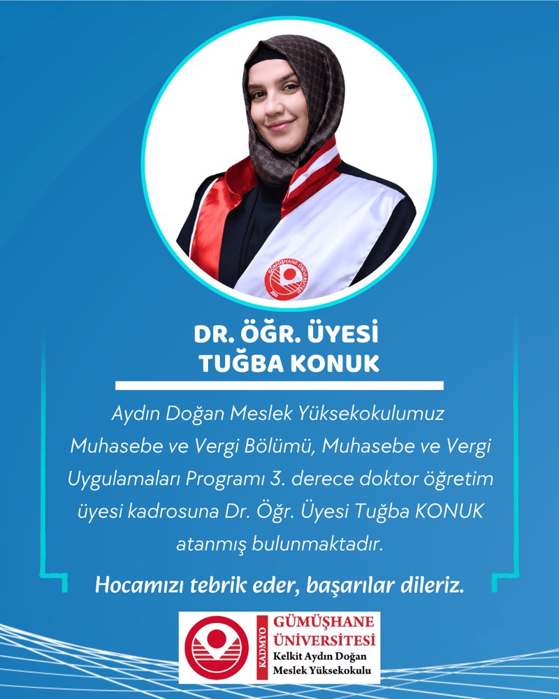 Yüksekokulumuz Muhasebe Ve Vergi Bölümü, Muhasebe Ve Vergi Uygulamaları Programı 3. Derece Doktor Öğretim Üyesi Kadrosuna Dr. Öğr. Üyesi Tuğba KONUK Atanmış Bulunmaktadır.