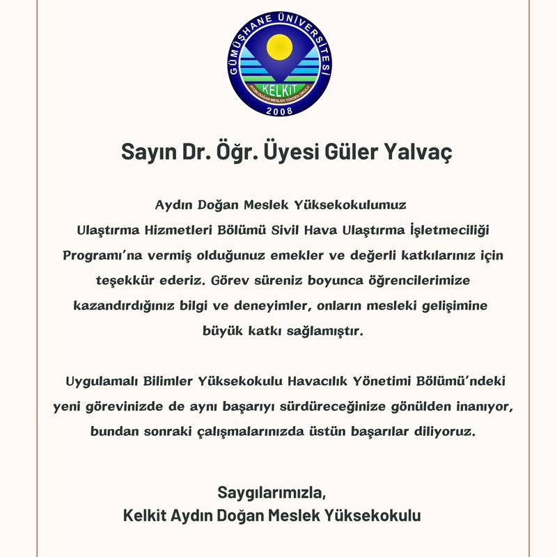 Yüksekokulumuz Ulaştırma Hizmetleri Bölümü Akademik Personeli Dr. Öğr. Üyesi Güler YALVAÇ, Uygulamalı Bilimler Yüksekokulu Havacılık Bölümüne Atanmıştır.