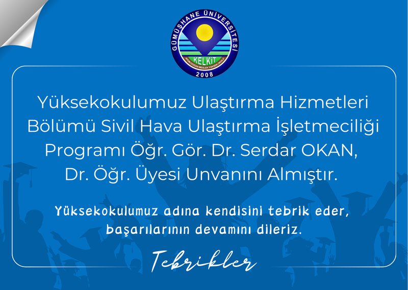 Yüksekokulumuz Ulaştırma Hizmetleri Bölümü Sivil Hava Ulaştırma İşletmeciliği Programı Öğr. Gör. Dr. Serdar OKAN, Dr. Öğr. Üyesi Unvanını Almıştır.
