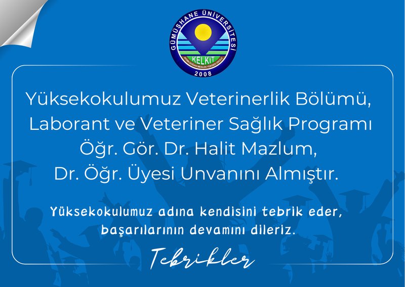 Yüksekokulumuz Veterinerlik Bölümü, Laborant ve Veteriner Sağlık Programı Öğr. Gör. Dr. Halit Mazlum, Dr. Öğr. Üyesi Unvanını Almıştır.
