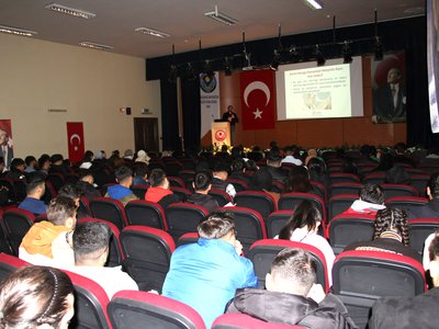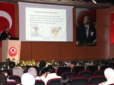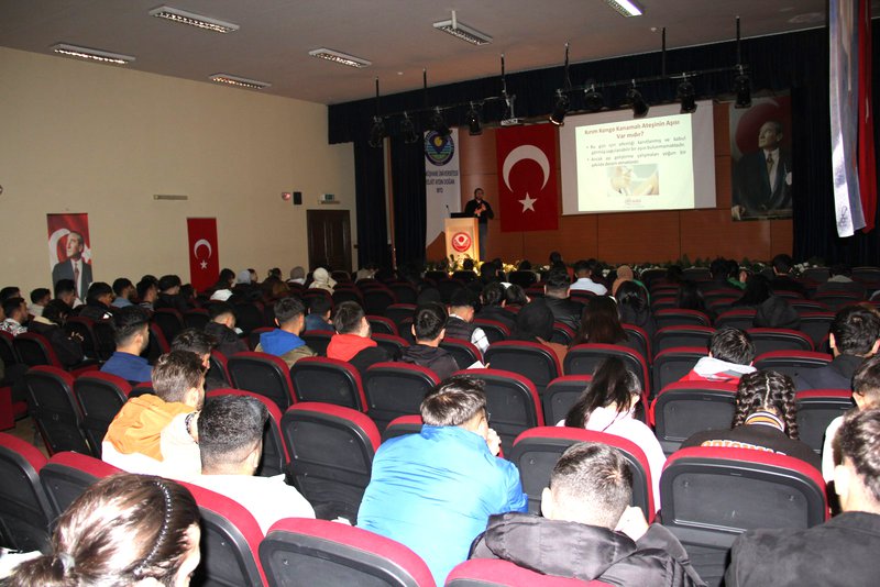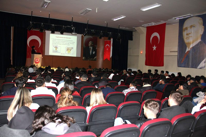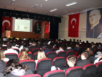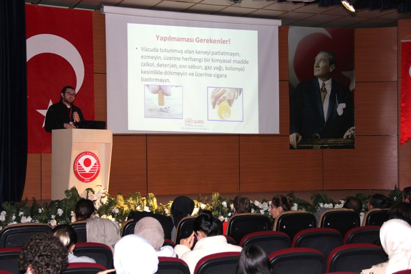 Dr. Emin Bera BALCI tarafından KKKA'nın önemine vurgu yaparak, öğrencilere bu tür hastalıklara karşı bilinçli olmanın önemini detaylı bir sunum gerçekleştirerek, hastalığın belirtileri ve keneyle temas halinde en yakın sağlık kuruluşuna başvurulması konusunda bilgilendirme yaptı. Ayrıca, hastalıktan korunma yolları ve semptomların görülmesi halinde neler yapılması gerektiğini anlattı.